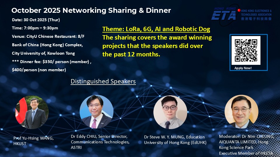 Theme: LoRa, 6G, AI and Robotic Dog The sharing covers the award winning projects that the speakers did over the past 12 months. Date: 30 Oct 2025 (Thur) Venue: CityU Chinese Restaurant: 8/F Bank of China (Hong Kong) Complex, City University of, Kowloon Tong Time: 7:00pm – 9:30pm Dinner fee:$350/ person (member) , $400/person (non […]