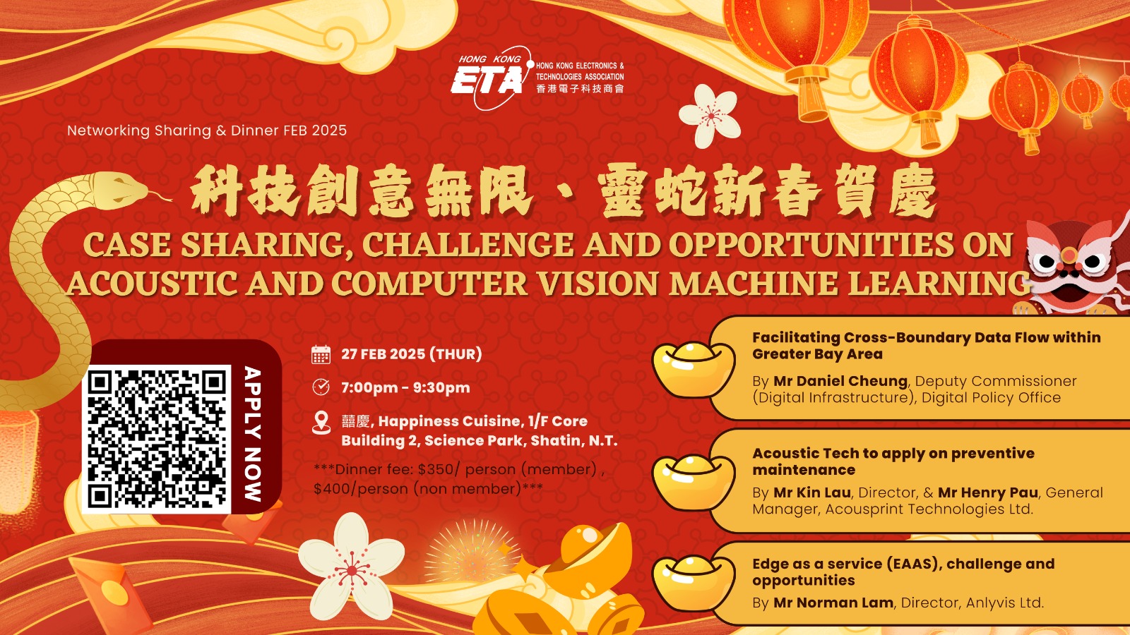 Theme: “Case sharing, challenge and opportunities on acoustic and computer vision machine learning” Date: 27 Feb 2025 (Thur) Venue: Happiness Cuisine, 1/F Core Building 2, Science Park, Shatin, N.T.Time: 7:00pm – 9:30pm Dinner fee: $350/ person (member) , $400/person (non member) PROGRAMME RUNDOWN 6:45 pm Registration and networking 7:00 pm Networking sharing starts 7:35 […]