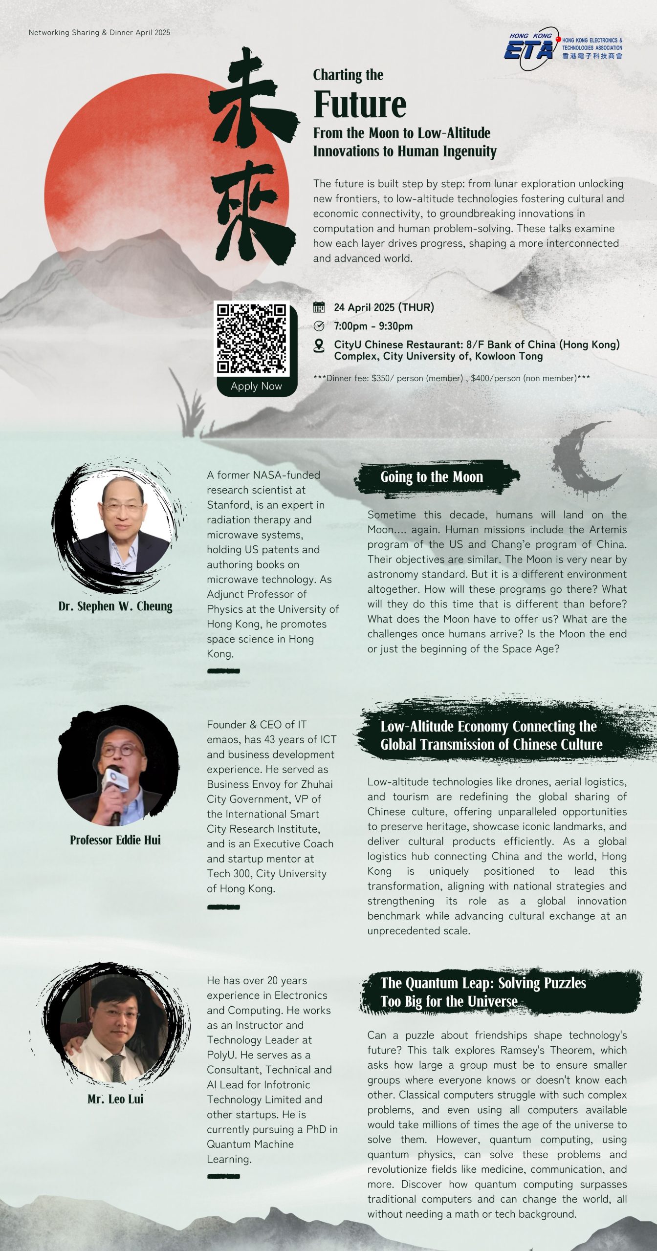 Theme: Charting the From the Moon to Low-Altitude Innovations to Human Ingenuity (未來) Date: 24 Apr 2025 (Thur) Venue: : CityU Chinese Restaurant: 8/F Bank of China (Hong Kong) Complex, City University of, Kowloon Tong Time: 7:00pm – 9:30pm Dinner fee:$350/ person (member) , $400/person (non member) CLICK HERE FOR REGISTRATION! PROGRAMME RUNDOWN 6:45 pm Registration […]